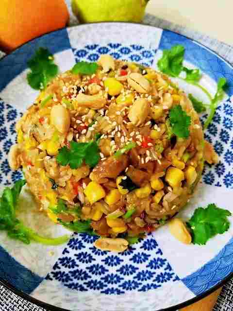 3、再下入糯米饭炒散,加少许生抽和糖、芫茜炒匀,扣入碟,洒上熟芝麻和花生装饰即成。